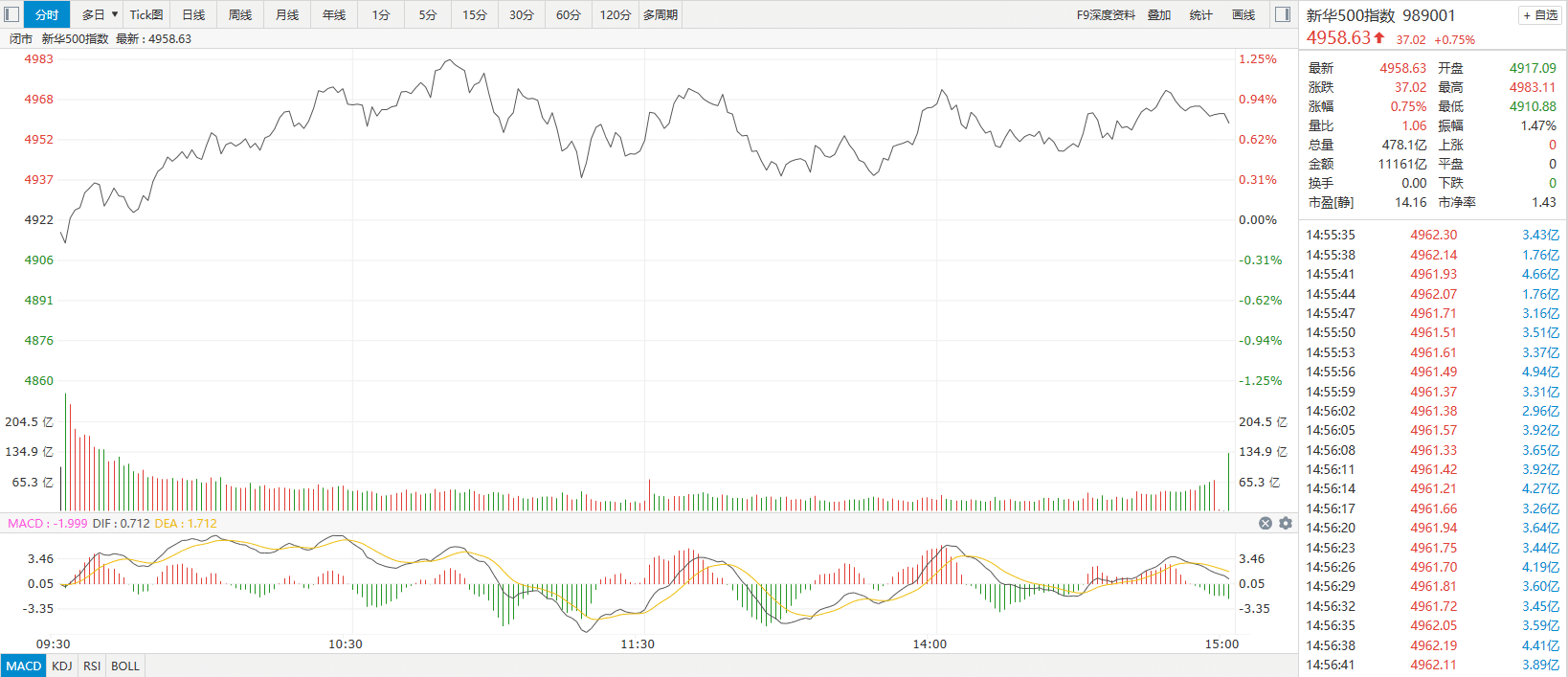 指数盘中最高触及 4983.11 点,最低触及 4910.88 点,成分股全天总成交额报 11161 亿元,总成交额较上一交易日放量。