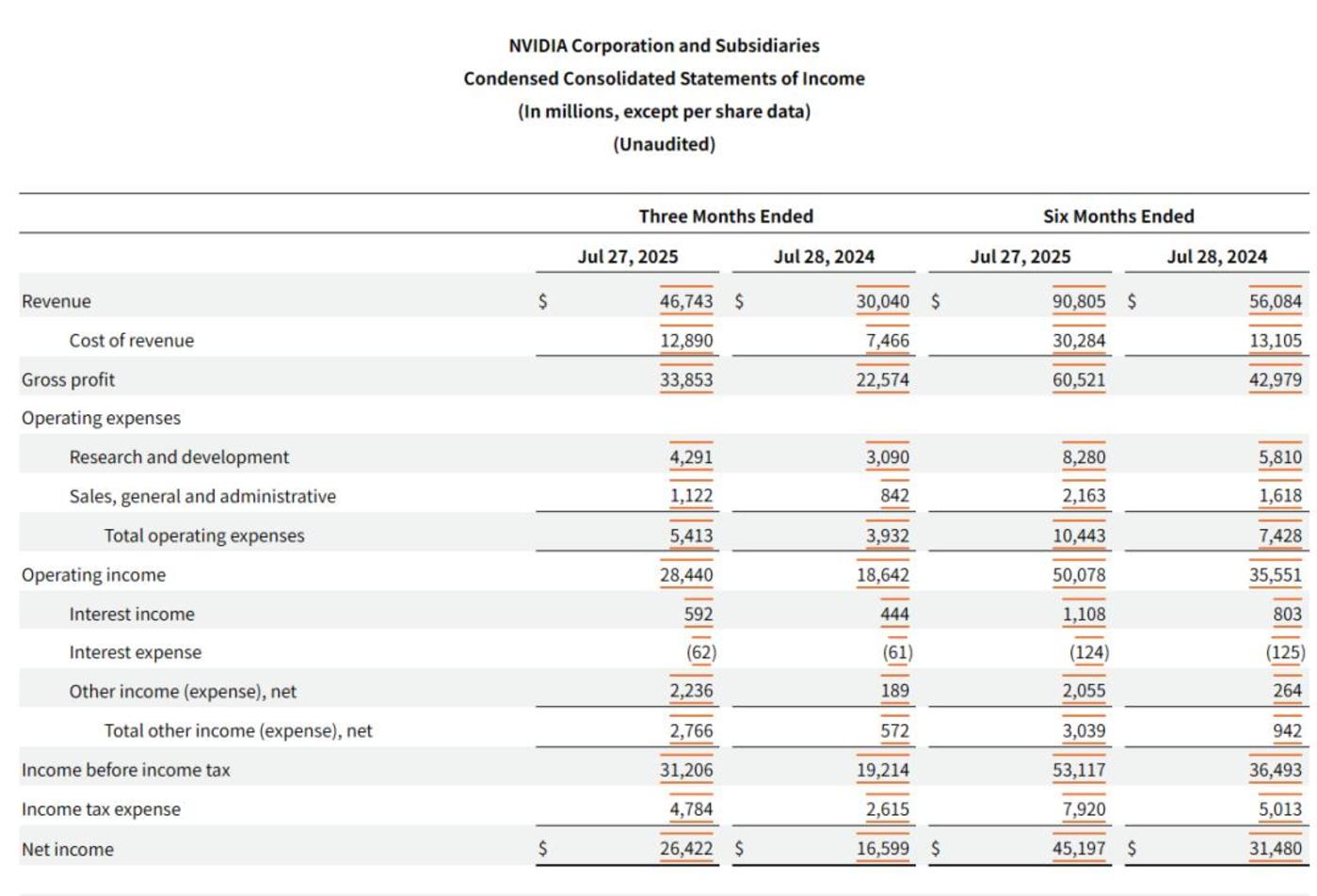 英伟达在整个 2026 财年第二季度依然保持了高速增长的态势。于此同时,英伟达也保持了超高的营收质量。