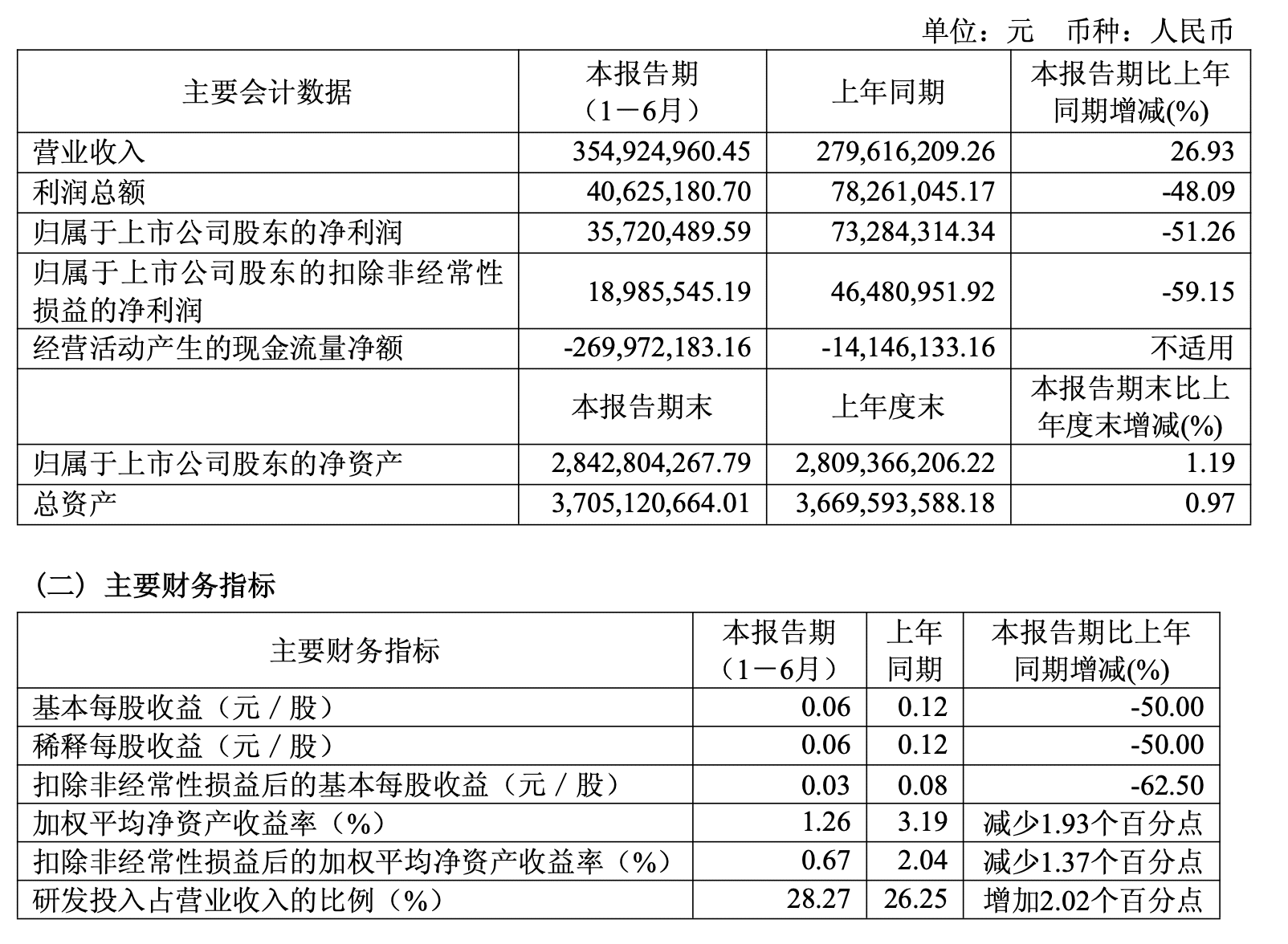 报告期内,该公司研发投入合计 1.00 亿元,同比增长 36.67%,研发投入总额占营收比例为 28.27%,增加 2.02 个百分点。根据研发项目需求,之前承接的国家拨款项目完结,自研项目增加,导致本期研发费用同比增加。