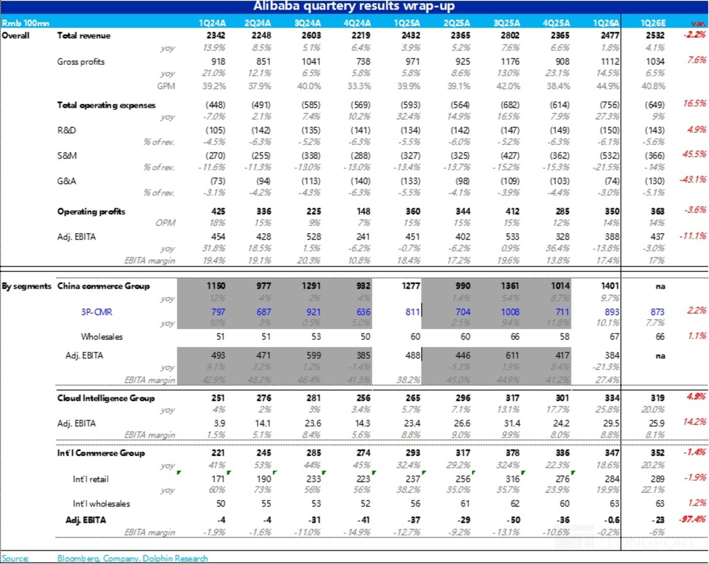 当前市场最关心的问题之一,并入饿了么并大力投入淘宝闪购,到底造成了多少亏损?公司披露新中国电商集团本季的 adj.EBITA 为 384 亿,同比去年减少了约 104 亿。虽对该数并没有彭博一致预期,但海豚看到的某华尔街行的预测为 395 亿,可见因外卖导致的实际亏损是高于预期的,但差距不算很大。