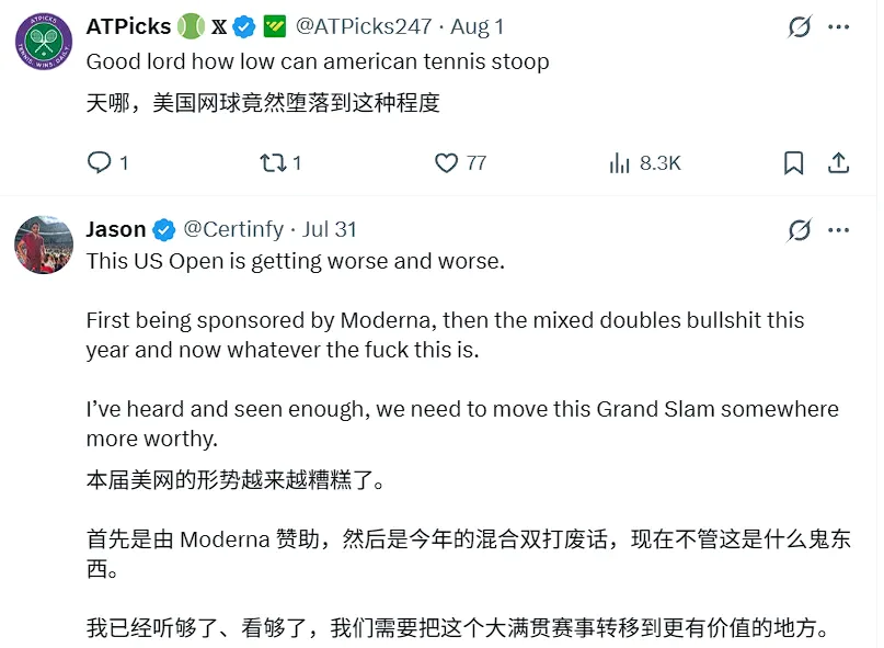 舆论层面,无论是彼时节目官宣还是播出后的反应,许多球迷都觉得这种尝试是在让美网掉价,消解了大满贯的专业性和身份。这种争论也揭示了一个问题: