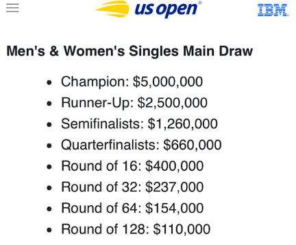 首先是最直接的——钱。本届美网总奖金池高达 9000 万美元,比去年的 7500 万增长了 20%。单打冠军奖金涨到 500 万美元 (约 3590 万元人民币)。