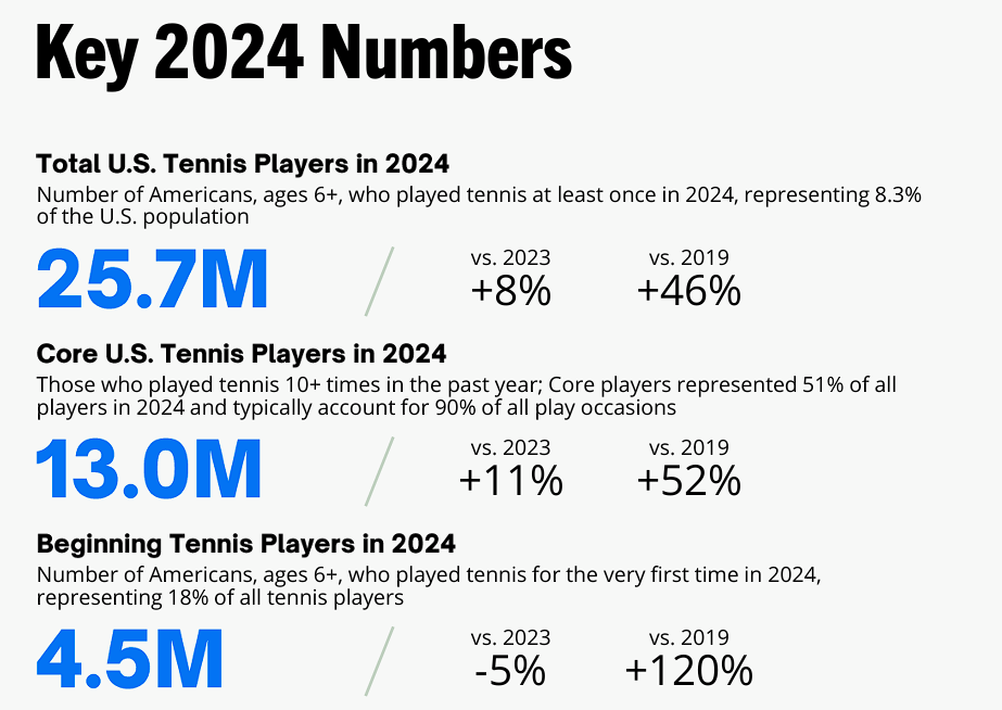 据美国网球协会 (USTA)的报告显示,2024 年美国有近 2570 万人打网球,创下历史新高。但在收视层面,职业网球依然远不及橄榄球、篮球等运动,且美网收视率有下降趋势。