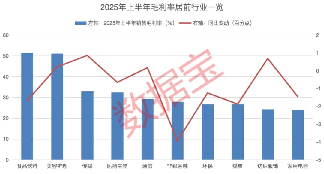 据证券时报·数据宝统计,剔除金融行业 (银行及非银金融),申万一级行业中,食品饮料行业今年上半年毛利率依旧稳居冠军宝座,达 51.41%;美容护理、传媒行业毛利率排在第二和第三位。