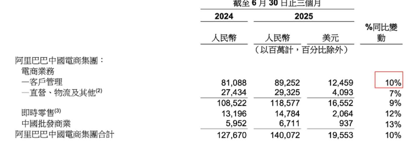 尽管该季度淘宝闪购成为最焦点业务,但我们仍然不能忽视阿里电商最基石的电商业绩,本季度淘天客户管理收入同比增长 10%,达到 892 亿元,对比之下上年同期该业务同比增速仅有 1%。