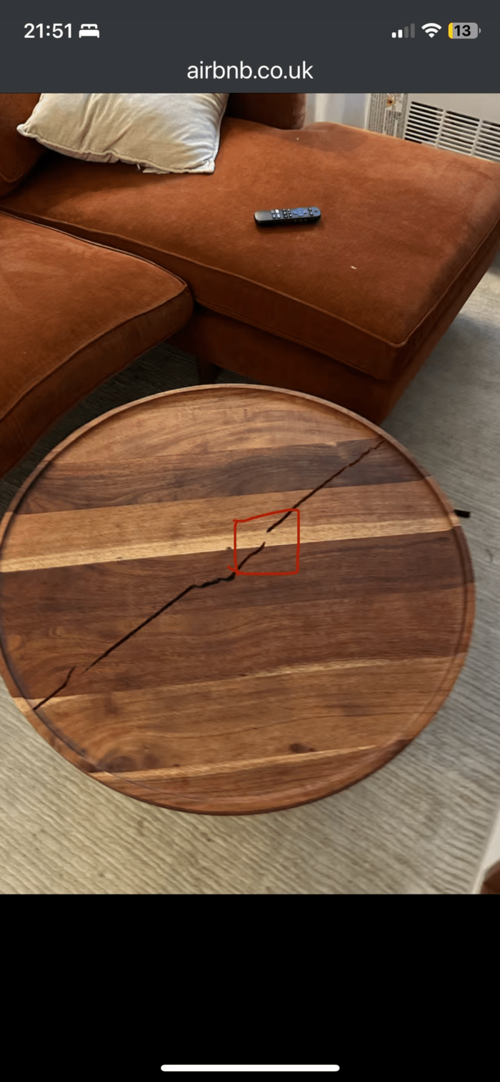 事情是这样的,一个 Airbnb 的房东在租客退房之后,找平台哭诉。说自己价值连城的桌子被租客整烂了,裂开这么大一道口子。