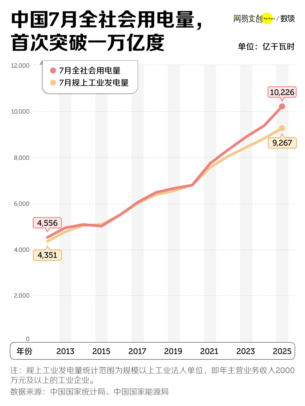 刚过去的七月,中国全社会用电量首次突破一万亿千瓦时,也是全球首次有国家单月用电量达到这个规模。