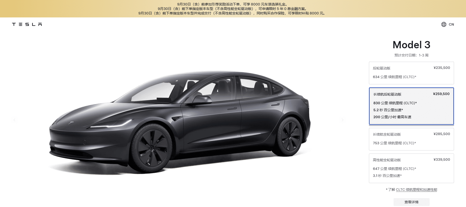 特斯拉官网显示,中国大陆地区 Model 3 长续航后轮驱动版价格下调 1 万元,调整后售价为 25.95 万元。该车型于 8 月 12 日正式发布,CLTC 续航可达 830 公里。
