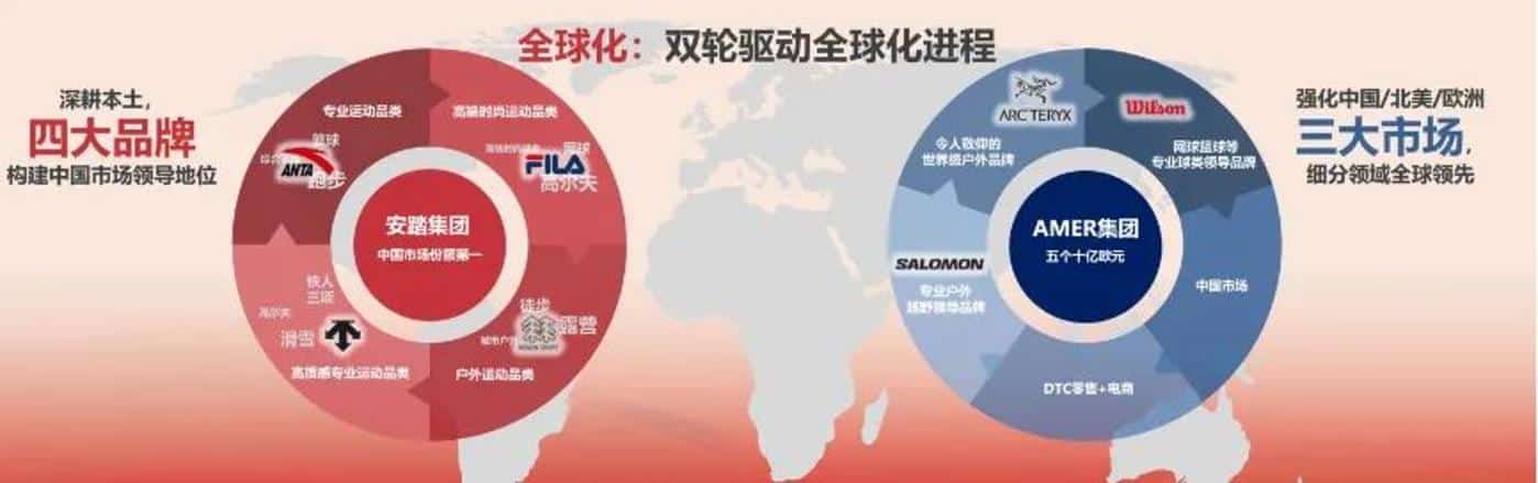 在一份安踏集团安踏集团整体发展方向的文件中,其全球化的的双轮驱动全球化进程就包括以安踏、FILA、可隆、迪桑特四大品牌深耕本土和以始祖鸟、威尔胜、萨洛蒙等强化北美和欧洲市场。