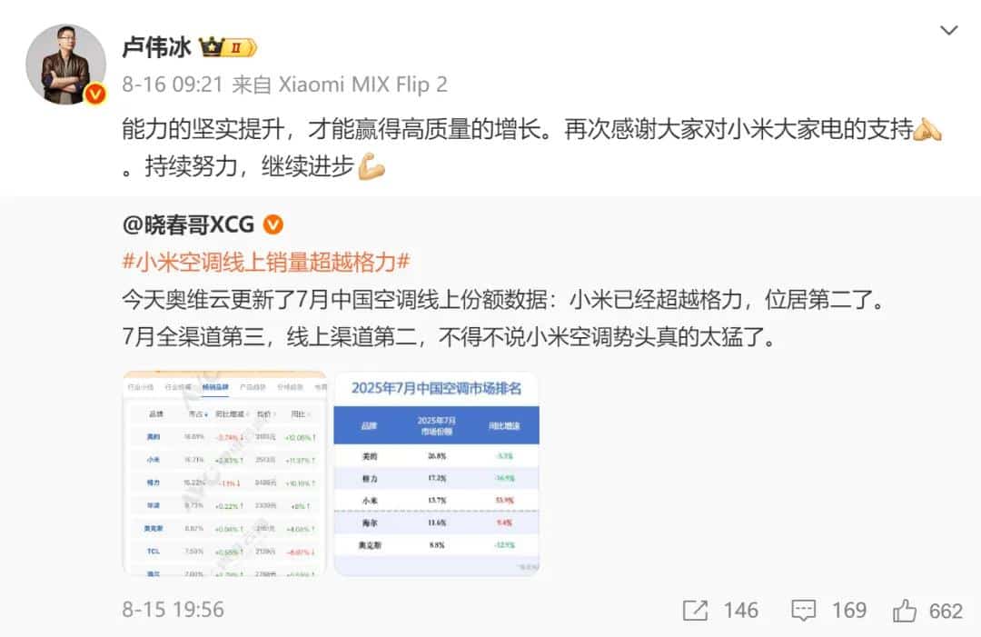 8 月 16 日一早,小米的卢伟冰转发了一条博主 @晓春哥 XCG 的微博,微博内容是一条奥维云网的截图,数据显示,小米空调线上销量市占率首次超过格力,仅次于美的,位居第二,全渠道市场份额则排第三。