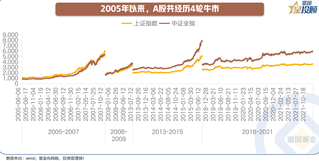 由于很多资料最早只能回溯至 2005 年,故本次复盘仅讨论此后的 A 股牛市。以中证全指涨幅超 50% 作为 A 股牛市的标准,2005 年以后共发生 4 轮牛市。