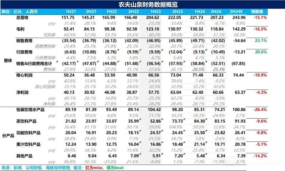 由于绿瓶水本身价格低,需要的渠道推广费用较少,因此费用的控制上整体还是超出市场预期的。尽管费用上公司一再控制,但最终 24H2 核心经营利润还是同比下滑了 11%,不及市场预期。