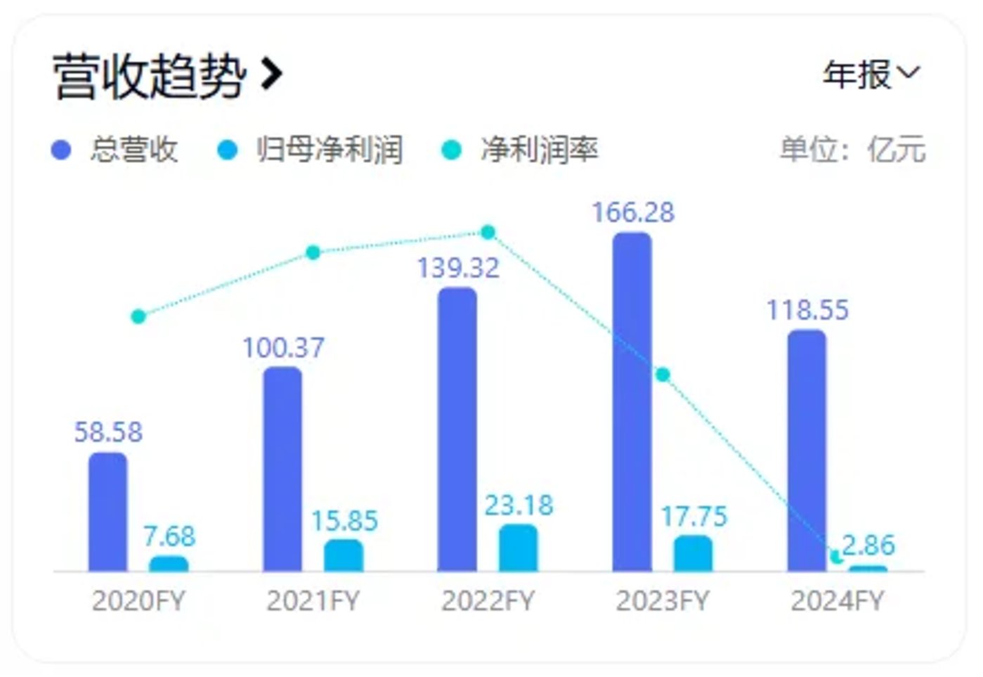 2024 年,先导智能业绩骤降,营收大降 29%,归母净利润更是大降 85%,仅盈利了 2.86 亿元。这是继 2023 年先导智能盈利下降 23% 之后,再一次业绩大幅下滑。