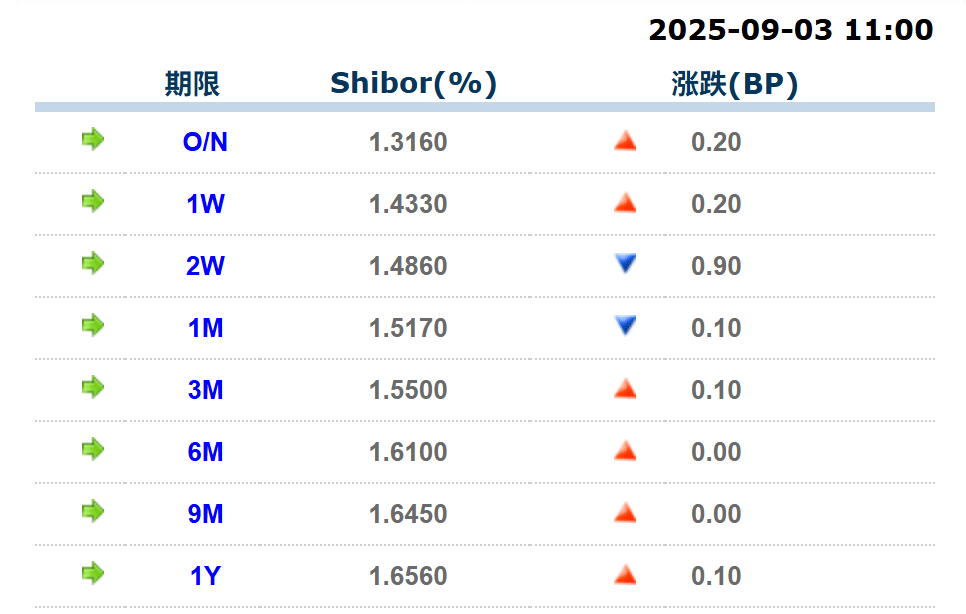 上海银行间同业拆放利率 (Shibor) 短期品种涨跌互现。具体来看,隔夜 Shibor 上涨 0.20BP,报 1.3160%;7 天 Shibor 上涨 0.20BP,报 1.4330%;14 天 Shibor 下跌 0.90BP,报 1.4860%。