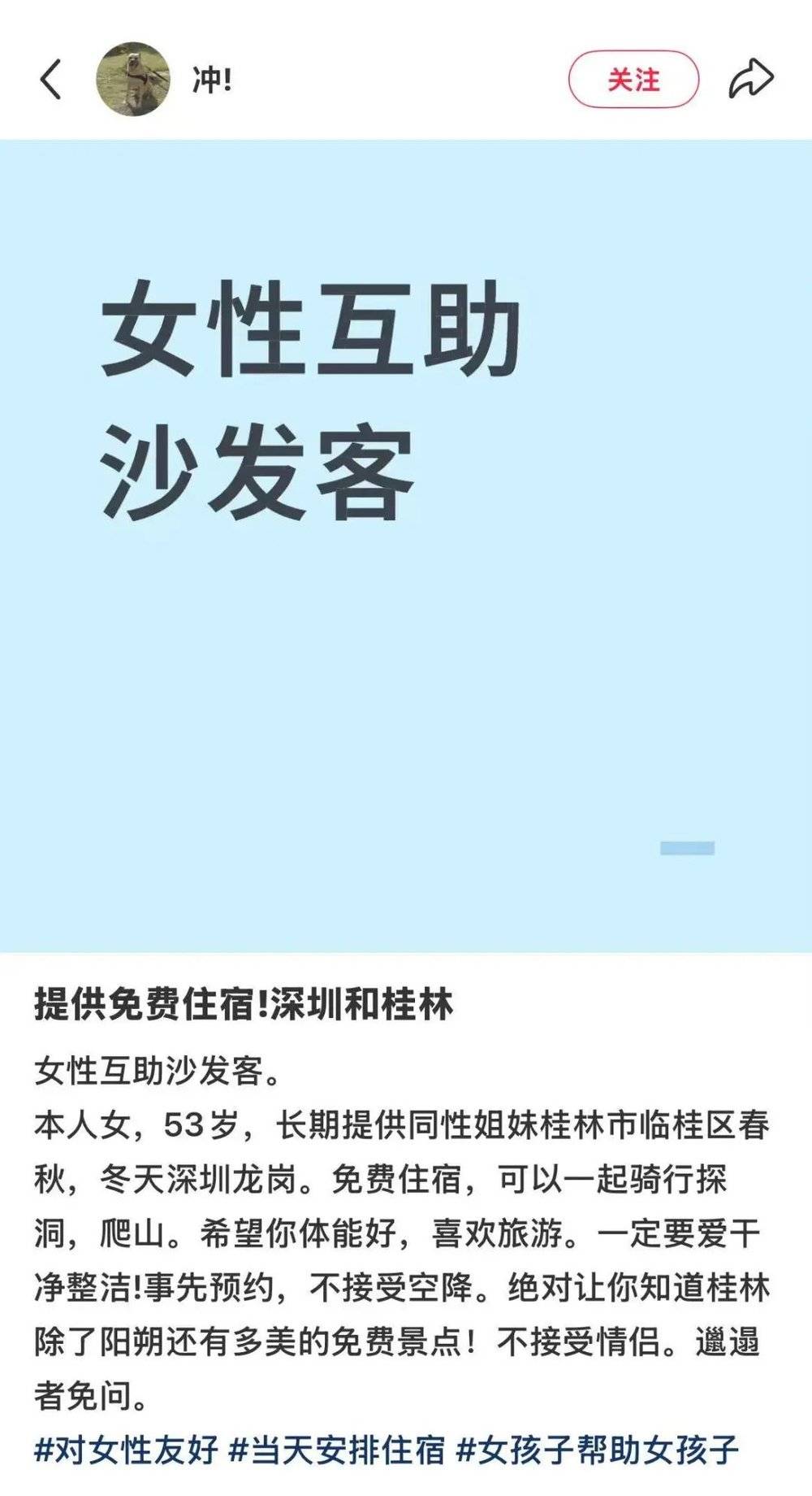 在社交平台上,不乏自称提供免费住宿的人,他们只对沙发客的性别作要求,其他并无更多说明。