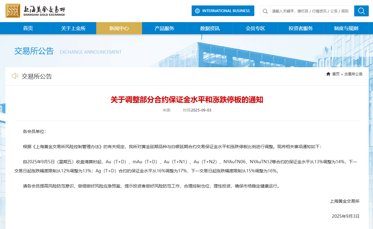 黄金外汇上金所调整部分合约保证金水平和涨跌停板 2025 年 9 月 4 日2025 年 9 月 4 日70 文章来源:金投网 2025 年 9 月 3 日,上海黄金交易所发布 《关于调整部分合约保证金水平和涨跌停板的通知》,通知称,将对黄金延期品种与白银延期合约交易保证金水平和涨跌停板比例进行调整。 通知原文如下: