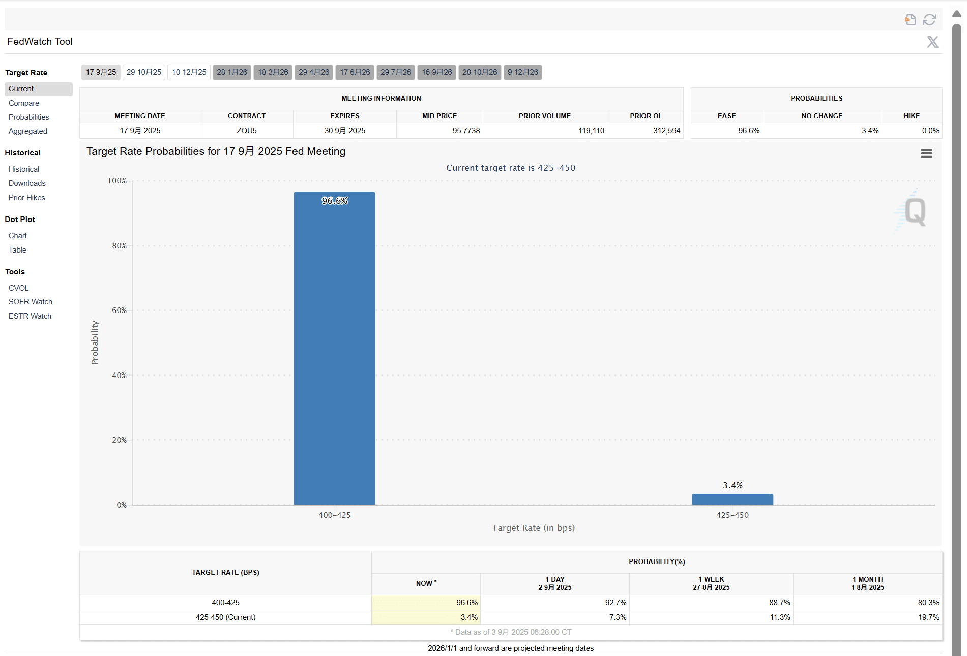 芝商所 「美联储观察」 工具显示,市场目前预计,9 月降息 25 个基点的概率高达 96.6%,而维持利率不变的概率仅为 3.4%。