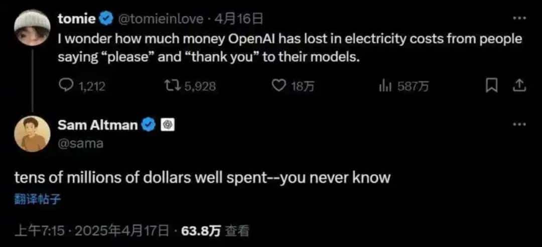 OpenAI 创始人山姆·奥特曼的一句估算,让全球用户陷入沉默:每年因用户对 AI 说 「请」 和 「谢谢」,产生的额外电费高达数千万美元。