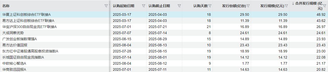 今年以来,截至 9 月 3 日,已经完成募集的公募权益类基金当中,发行规模最大的是华夏上证科创综合 ETF 联接,合并发行规模为 48.92 亿元。