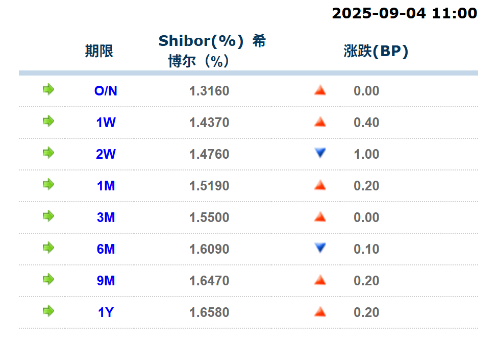 上海银行间同业拆放利率 (Shibor) 短期品种涨跌互现。具体来看,隔夜 Shibor 上涨 0.00BP,报 1.3160%;7 天 Shibor 上涨 0.40BP,报 1.4370%;14 天 Shibor 下跌 1.00BP,报 1.4760%。