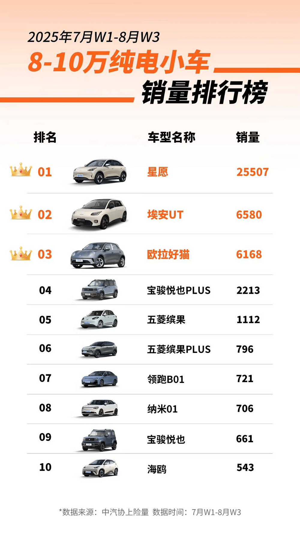 来自中汽协的 8—10 万元电动上险量数据显示,最近这个售价区间内的小型电动车整体上险数据其实到了非常危险的地步,除了 25507 辆的吉利星愿之外,剩下的没有一款产品上险量数据过万。