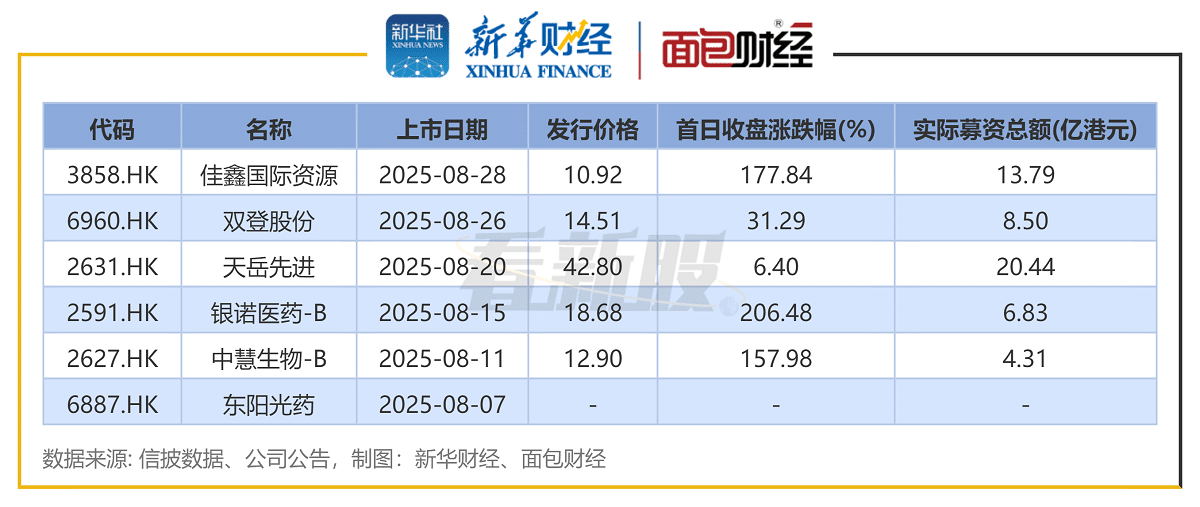 8 月,港交所共有 6 只新股上市,合计募资总额达 53.86 亿港元。其中,天岳先进、佳鑫国际资源首发募集总额居前,分别达 20.44 亿港元、13.79 亿港元。2025 年 6 月、7 月,港交所分别有 15 只、9 只新股上市,IPO 募资规模分别为 300.35 亿港元、198.59 亿港元,由此来看近期港股发行节奏在持续放缓。