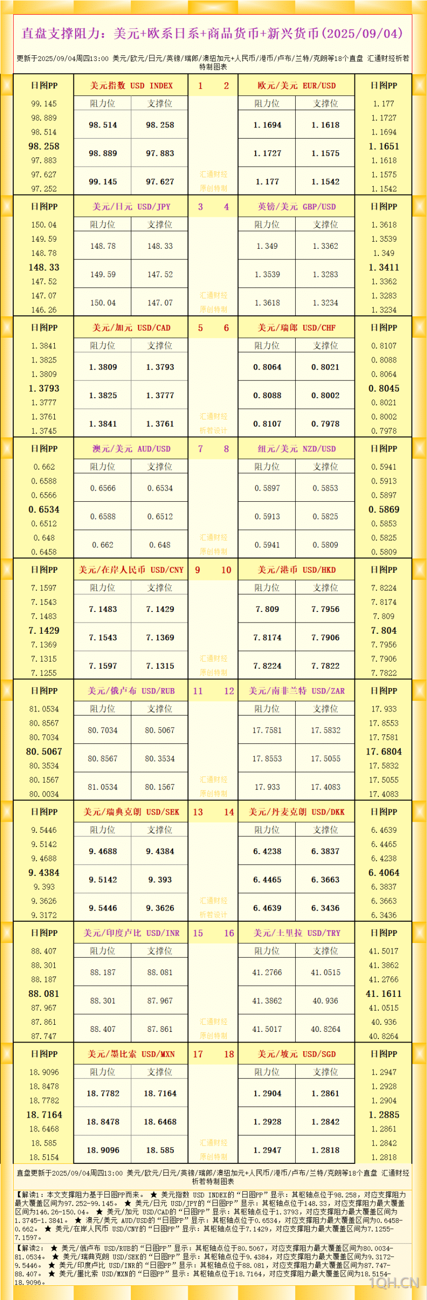 一张图看直盘支撑阻力:美元+欧系日系+商品货币+新兴货币,更新于 2025 年 9 月 4 日周四 13:00,具体美元/欧元/日元/英镑/瑞郎/澳纽加元+人民币/港币/卢布/兰特/克朗等 18 个直盘,更多详见汇通财经析若特制图表中的内容。