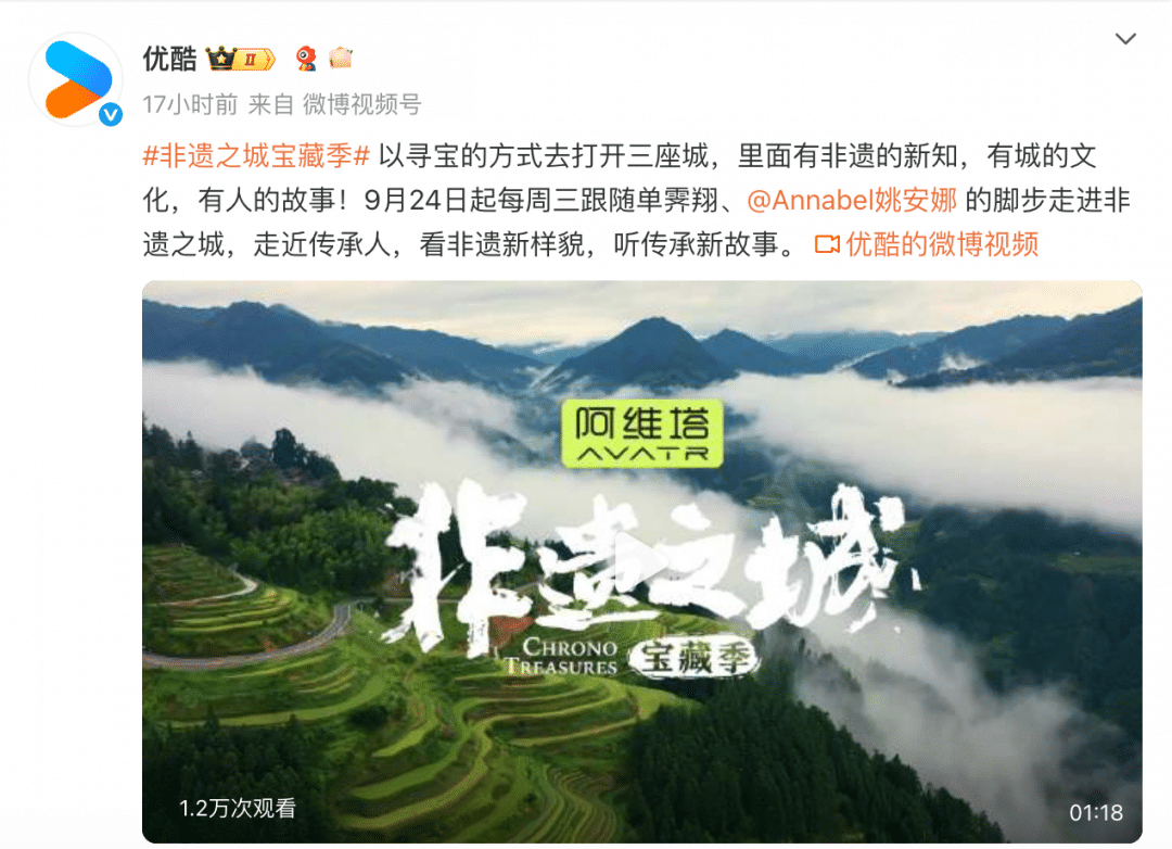 基于此,优酷正式公布了 「优酷非遗 100 城计划」,未来计划探索全国 100 座非遗之城,系统纪录和讲述非遗文化故事,认真践行 「可持续非遗」。