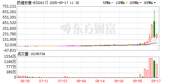 16 日,药捷安康 (02617.HK) 上演极端行情:早盘一度暴涨 63% 至 679.5 港元/股,午后直线跳水,报收 192 港元/股,跌幅达 53.73%。公司午间紧急公告,称 「概不知悉股价异动原因,业务营运及财务状况无重大变动」。