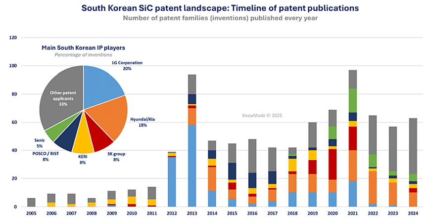 这一年似乎标志着大多数韩国工业参与者对 SiC 活动的重组,SKC 剥离了一家 SiC 基板公司 (Senic),LG Innotek 出售了关键的 SiC 专利 (LX Semicon、S-tech),SK Inc. 收购了 Yes Powertechnix(YPT)。与此同时,几家材料公司大幅减少了其知识产权活动 (浦项制铁、LG 集团和 SK 集团)。