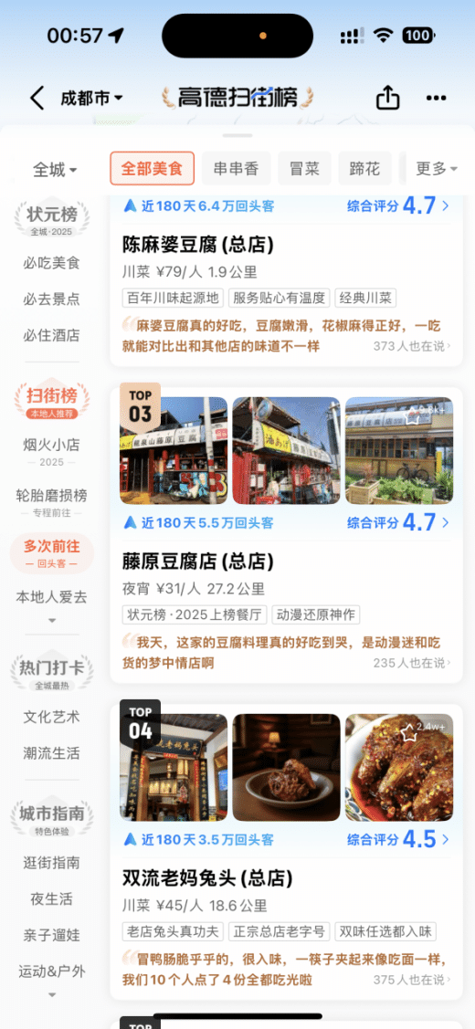 高德地图 CEO 郭宁说过,「高德扫街榜是 AI 时代 『用脚投票』 的最真实榜单」。但现在的榜单怕是用脚到不了的。榜上的春熙路店到我搜索时所处的龙泉山足有 30 公里,如果是双脚怕是要赶上一天才够给它投票。但还是要感谢高德地图,没有把藤原豆腐店 (都江堰店)推荐到这个榜单,那就是 70~80 公里了。可能高德用的脚是 AI 的脚,确实是远超人类。