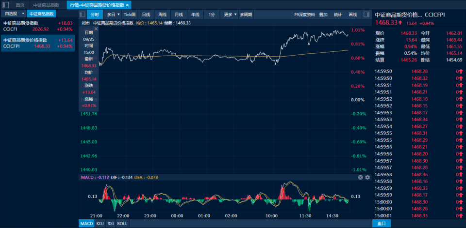 截至 25 日下午收盘,中证商品期货价格指数收报 1468.33 点,较前一交易日上涨 13.64 点,涨幅 0.94%;中证商品期货指数收报 2026.92 点,较前一交易日上涨 18.83 点,涨幅 0.94%。