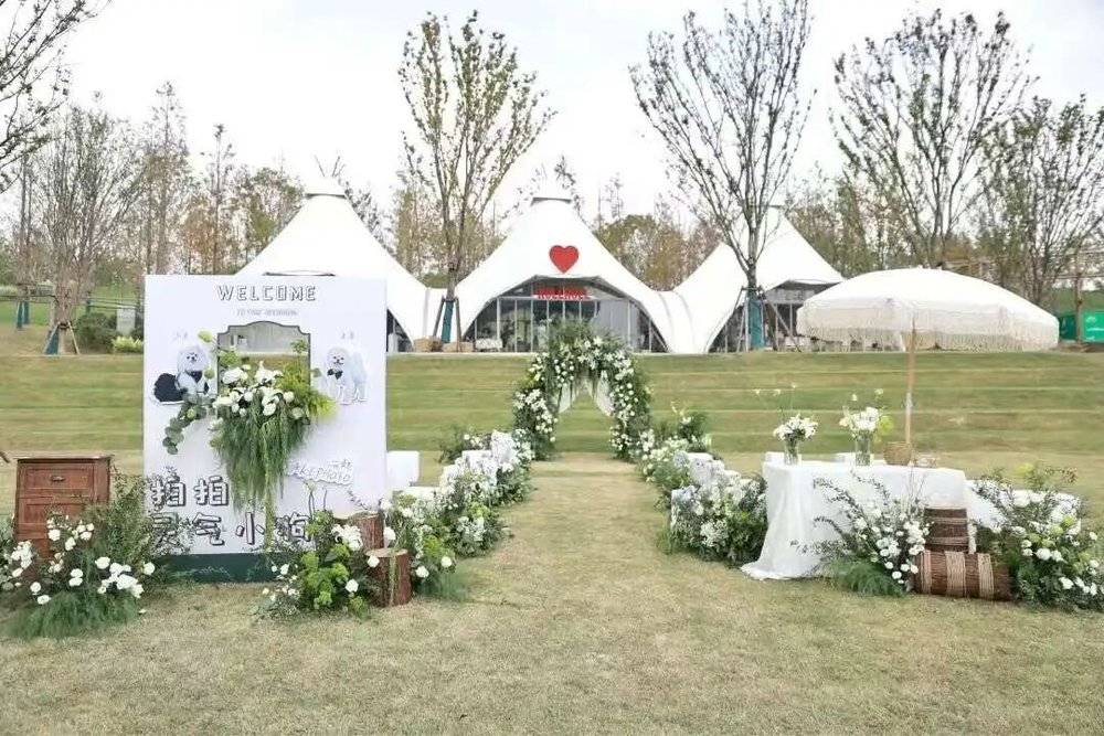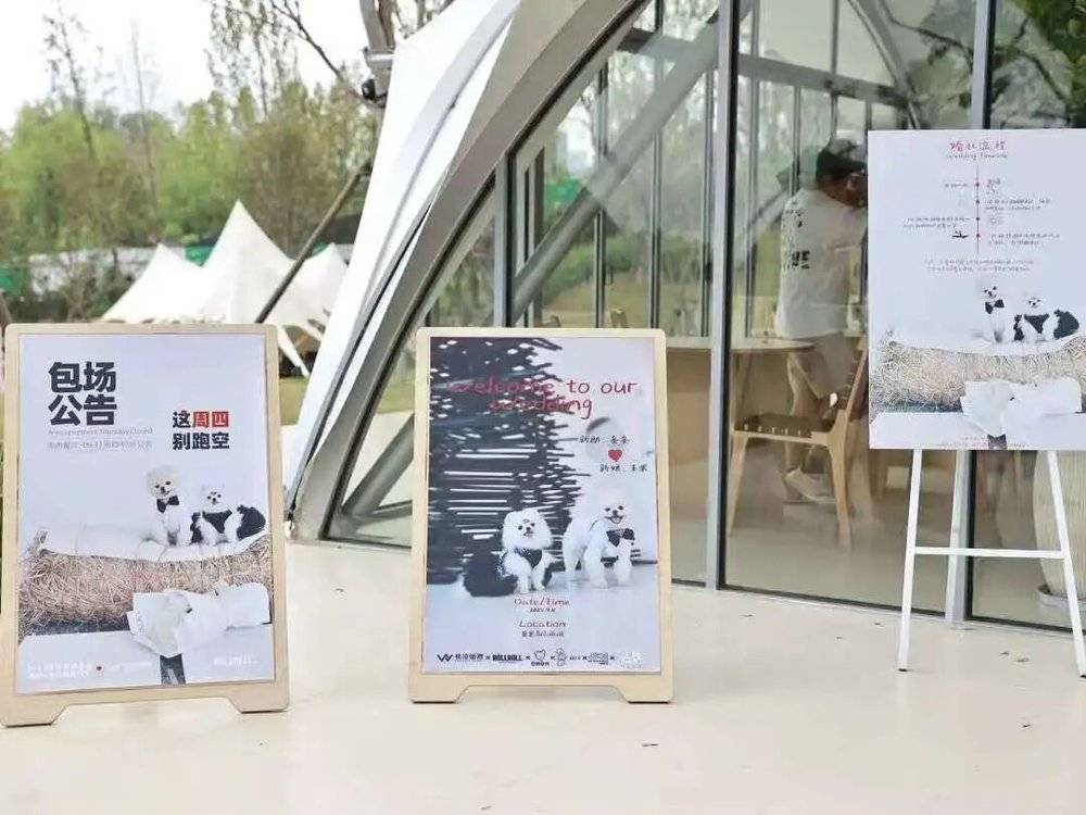 两只 「新狗」 的婚礼在一家五星酒店的草坪上举行。婚礼现场被布置得美轮美奂,到场的狗狗用它们的狗爪拍到签到墙上,仪式感拉满。