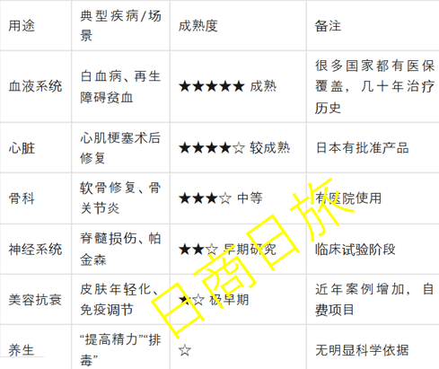 日本厚生劳动省公布的数据是,2023 年备案的干细胞医疗计划约 4000 件,其中约 80% 是私人诊所项目。60% 以上集中在皮肤美容、抗衰老,治疗型项目 (心脏病、脊髓损伤)不到 30%。理论上,同一个诊所既能做自体脂肪干细胞提取并用于关节修复,又能做异体脐带干细胞用于美容抗衰。