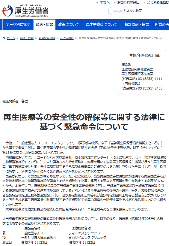 这位 50 多岁的患者是为了治疗慢性疼痛而接受干细胞点滴治疗,抽取了自己的脂肪,因此是自体干细胞。涉事诊所位于东京,细胞加工中心 (Cell Processing Center,CPC)是附近琦玉县的第三方公司。消息发布是 29 日,承担法律责任的主体进行过一次更名,是在 22 日和 25 日,因此我们无法判断具体死亡时间,以及是否因为担心恶性事件产生负面效应而紧急更名。厚劳省命令该诊所停止了相关干细胞治疗项目,细胞加工公司也暂停生产类似产品。