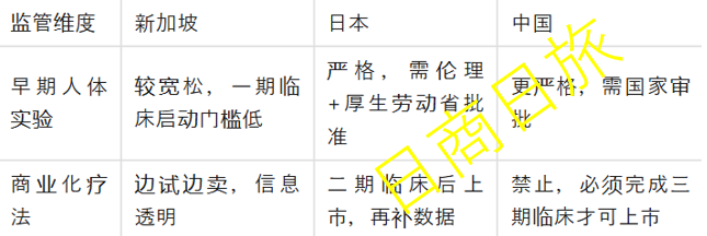不查不知道,新加坡才是实现了 「干细胞自由」 的国度,临床一期后就能边试边卖,而且出口自由。所以,在干细胞这个赛道,日本反倒像是全球的 「最后一公里」?