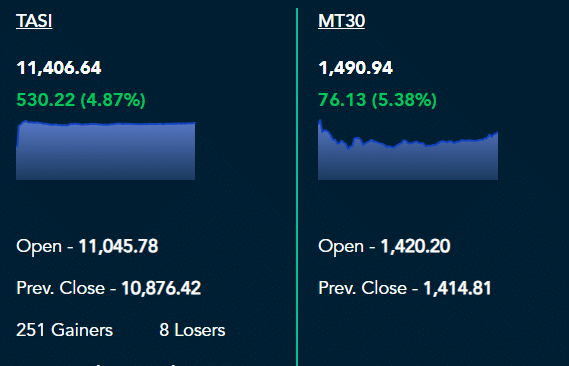 截至发稿,沙特 TASI 指数涨超 4.8%,MT30 指数涨约 5.4%。TASI 指数成分股中,251 家上涨,仅 8 家下跌;银行股指数一度涨超 9%,有望创历史最大单日涨幅。