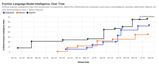 首先,Mistral AI 虽然是目前估值最高的大模型独角兽之一,但他们的产品在市场中并不受欢迎——阿姆斯特丹大学近期发布了一份调查报告显示 Mistral 在整个大模型赛道内的市场份额只有 2%,在 2025 年 1 月之后快速地被 Deepseek 和 OpenAI 拉开差距——这意味着 Mistral 无论是在产品差异上还是使用体验上,都没有拿出具有说服力的表现。