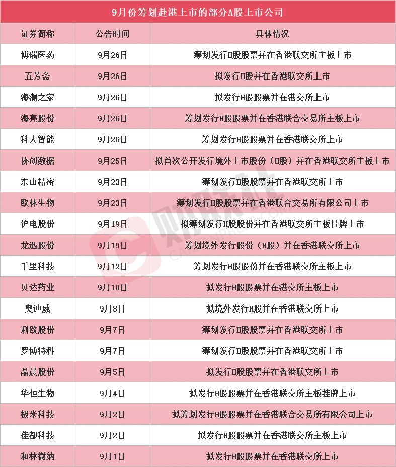 财联社 9 月 27 日讯 (编辑 平方)A 股公司赴港上市热潮延续。据财联社不完全统计,截至发稿,9 月份包括博瑞医药、五芳斋、海澜之家、海亮股份、科大智能、协创数据、东山精密、欧林生物、沪电股份、龙迅股份、千里科技、贝达药业、奥迪威、利欧股份、罗博特科、晶晨股份、华恒生物、极米科技、佳都科技、和林微纳在内的 20 家 A 股上市公司公告筹划赴港上市,详细情况见下图: