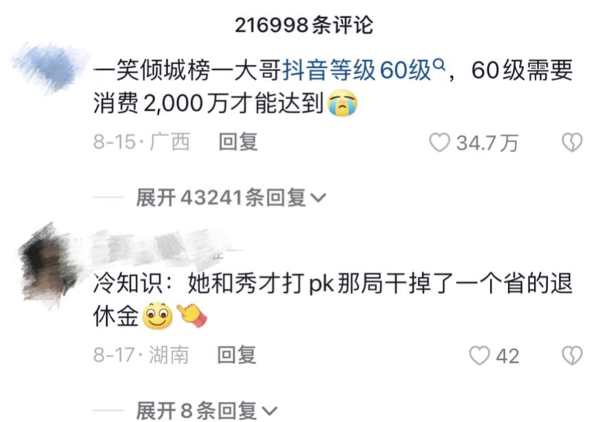 还有网友称,一笑倾城的榜一大哥疑似为她消费了 2000 万。