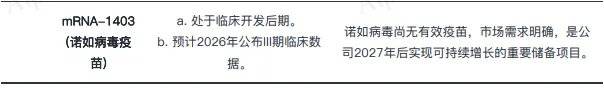 季节性流感疫苗 mRNA-1010 :III 期试验显示出优于现有疫苗的潜力,预计在 2025—2026 年上市,有望成为后新冠时期的首个重要收入来源。