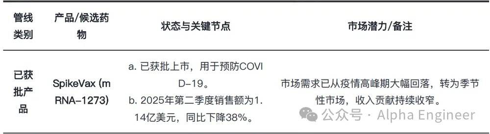 RSV 疫苗 mRESVIA(mRNA-1345):作为公司在呼吸道合胞病毒(RSV)领域的首个产品,已获批用于 18—59 岁高风险成人及 60 岁以上人群,标志着公司产品组合开始向新冠以外的领域拓展。