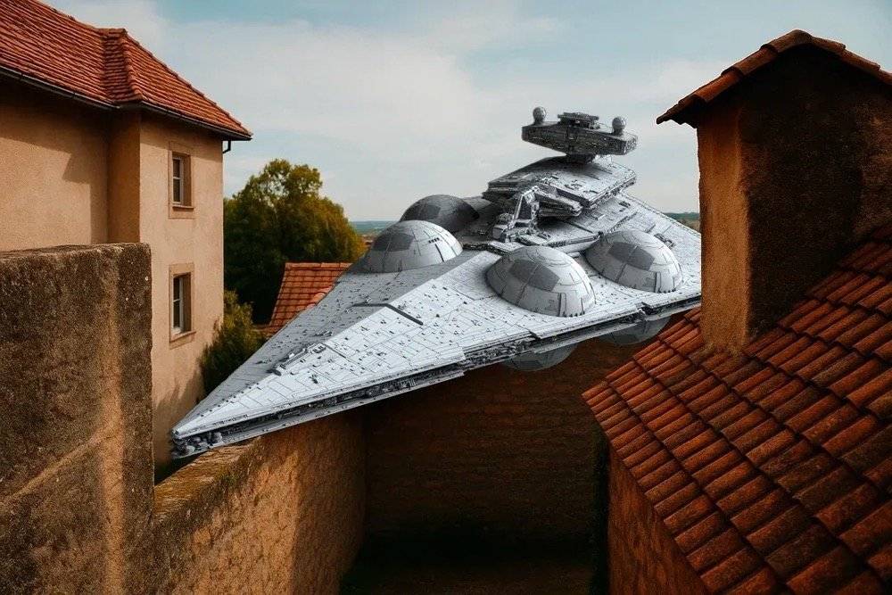 比如在这个版本中,《星球大战》 的帝国战舰降落在尼埃普斯的家中,整个画面瞬间穿越成了科幻片。