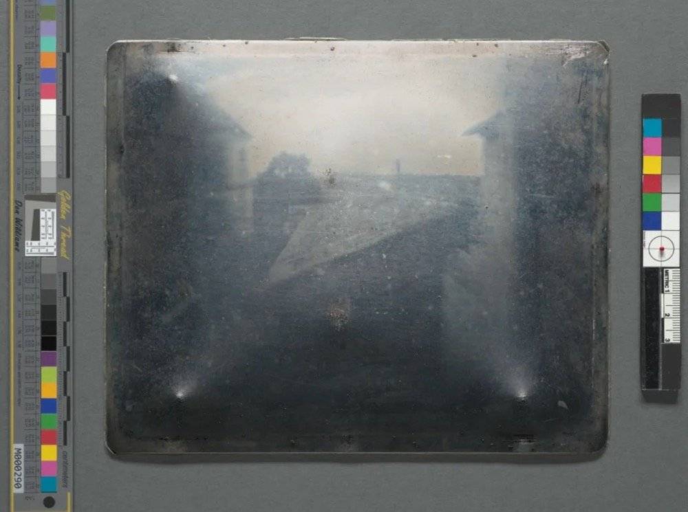 照片的作者尼埃普斯站在自家二楼的工作室窗边,架好镜头,对准庭院和远处景色,连续曝光几天,才在一块抛光锡板上捕捉到这段模糊而珍贵的影像。