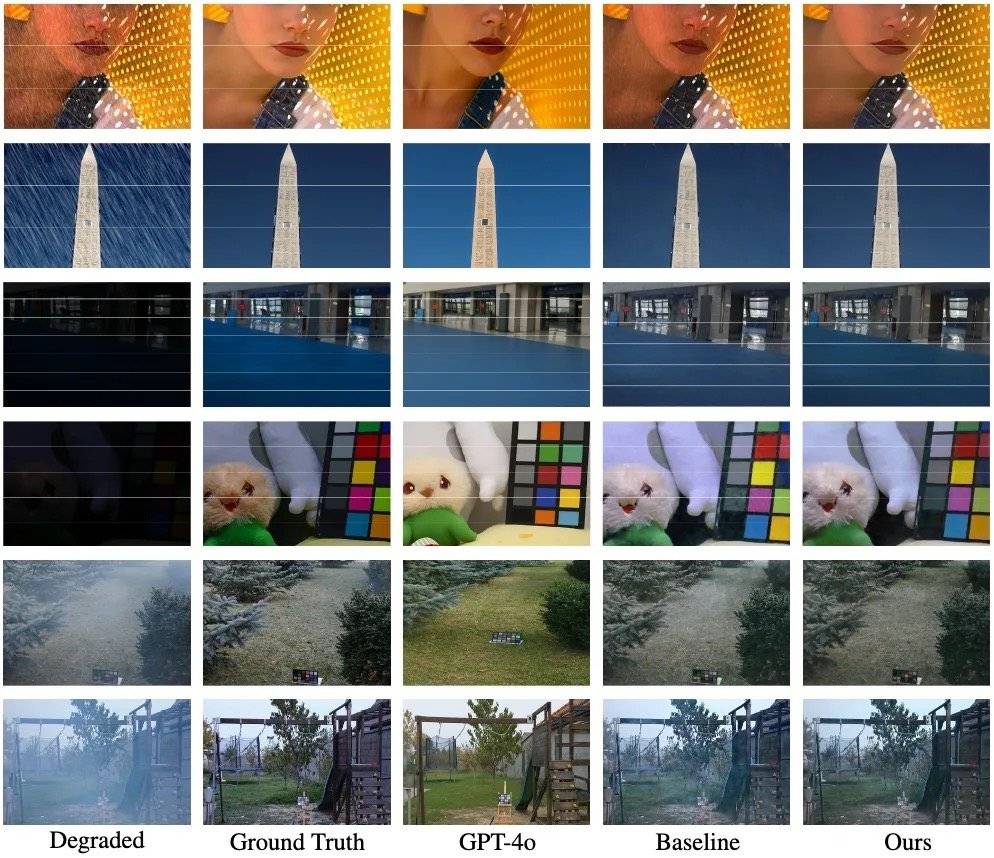 北京理工大学与澳大利亚国立大学今年联合发布了关于 GPT-4o 图像修复能力的实验结果。研究团队采用了一种直觉式方案:将退化图像输入 GPT-4o,提取语义特征并叠加其 「修复建议」,生成最终图像。
