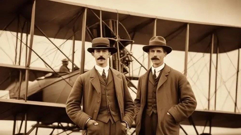 类似的还有一张号称莱特兄弟首次动力飞行的。画面中两名年轻男子站在一架古董双翼飞机前,表情神情自若。但对照历史档案,这同样是张假照片。