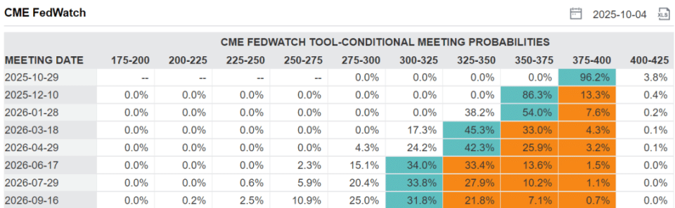 据 CME「美联储观察」,截至北京时间 10 月 4 日 06:30,美联储 10 月维持利率不变的概率为 5.4%,降息 25 个基点的概率为 94.6%;美联储 12 月维持利率不变概率为 0.6%,累计降息 25 个基点的概率为 15.4%,累计降息 50 个基点的概率为 84.0%。