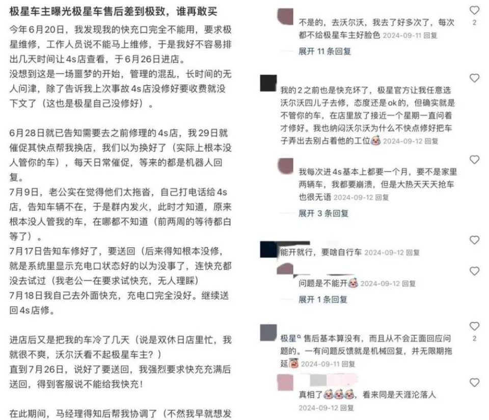 品牌在华式微,极星的老车主们遇到了维修售后难题。多位车主在社交平台上反馈极星售后体验不佳,问题包括 4S 店无人接待,且车辆没有经过真实检修便被送回。