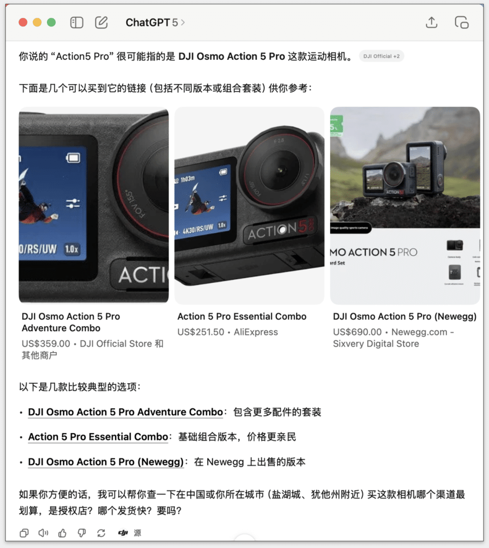 把需求在 chat GPT 里直接丢给它,说:「帮我找一台 Action 5 Pro。」 反馈挺快:几个电商页面的链接,价格区间写得清楚,还贴心地标出来哪个是 「套装版」、「单机身」。