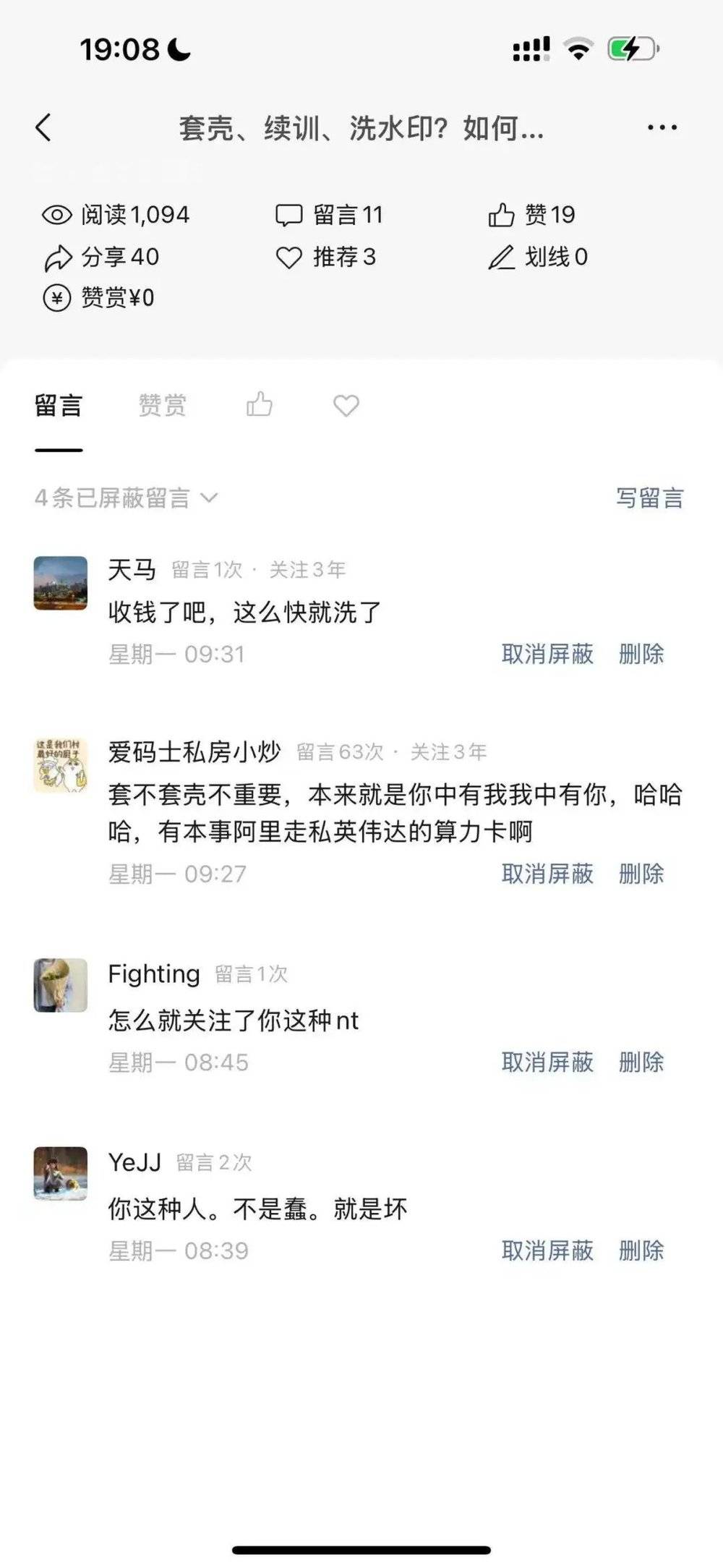 文章我设置的 8:28 自动推送,早上 9:00 醒来看了一眼,短短 30 分钟就阅读破千,评论也比平时要多不少,除了正常评论外,还有几个骂得挺厉害:
